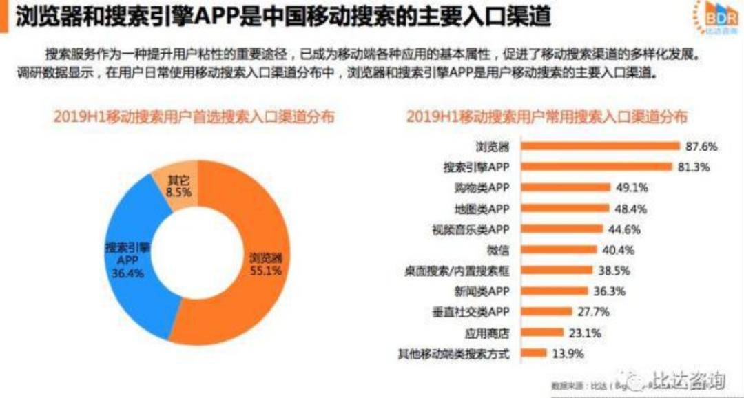 根据比达咨询报告,2019年上半年,浏览器和搜索引擎APP依旧是用户移动搜索的主要入口渠道。在移动搜索用户首选搜索入口渠道中,除浏览器和搜索引擎APP外,其它渠道占比8.5%。