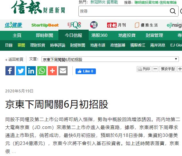 据香港信报报道,同股不同权及第二上市公司将可纳入恒指,势为中概股回流增添诱因。而内地第二大电商京东来港第二上市亦进入最后一步,据悉,京东将于下周寻求通过上市聆讯,倘若成功,最快6月初招股,预期于6月18日挂牌,集资约30亿美元(约234亿港元),京东今次将不会引入基石投资者。