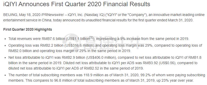 爱奇艺在周一美股盘后公布了2020年第一度财报。根据财报信息显示,第一季度总营收76亿元,同比增长9%,市场预期72.56亿元,去年同期70亿元,总营收和同比增速超公司此前预期。第一季度净亏损29亿元,市场预期亏损28.31亿元,去年同期亏损18亿元。
