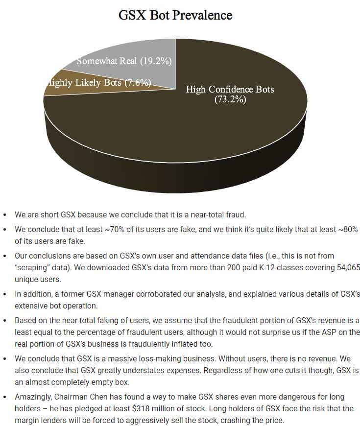 浑水称,跟谁学自己的200个付费课程的用户数据显示,至少有80%的用户是假的——这些用户都是「机器人」。浑水表示:「我们的结论是,跟谁学是一家大规模亏损的企业。没有用户,就没有收入。我们还得出一个结论,即跟谁学大大低估了费用。不管怎么看,跟谁学都几乎是个空壳。」