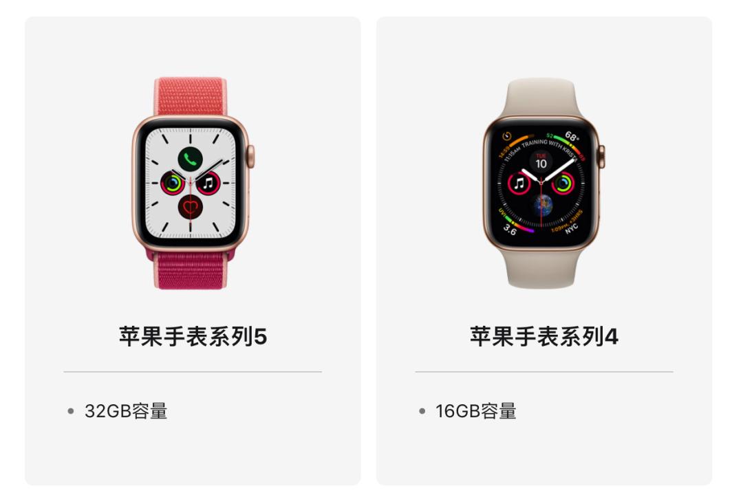 可能你不记得也不在乎 Apple Watch Series 4 和 Series 5 的内置存储空间大小,因为大多数人还是连着手机用的,存储空间变化影响不大。