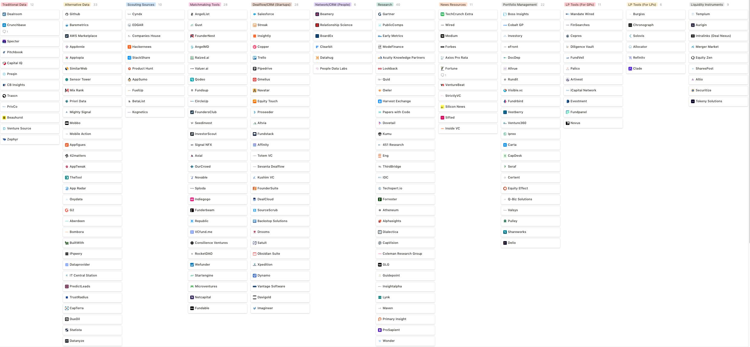 我在试着只考虑对投资来说必不可少的相关活动(以及毗邻的)。我不会讨论文档管理系统,董事会软件,市场营销,员工管理,网络安全或类似的用例,首先是因为它那些不是我的主战场,其次是因为可能有其他一些资源会帮助你解决这些问题。另外,有一些东西尽管特别有价值,但因为超出了讨论范围,所以我也没有列出来(比方说Zapier ,Notion,IFTTT等);