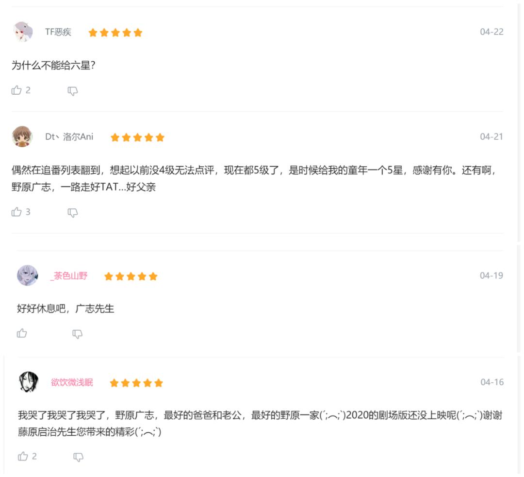 4月12日,野原广志的声优藤原启治去世,大批用户聚集在了B站《蜡笔小新》的评论区,想在这里向陪伴他们童年的声音道一声别。