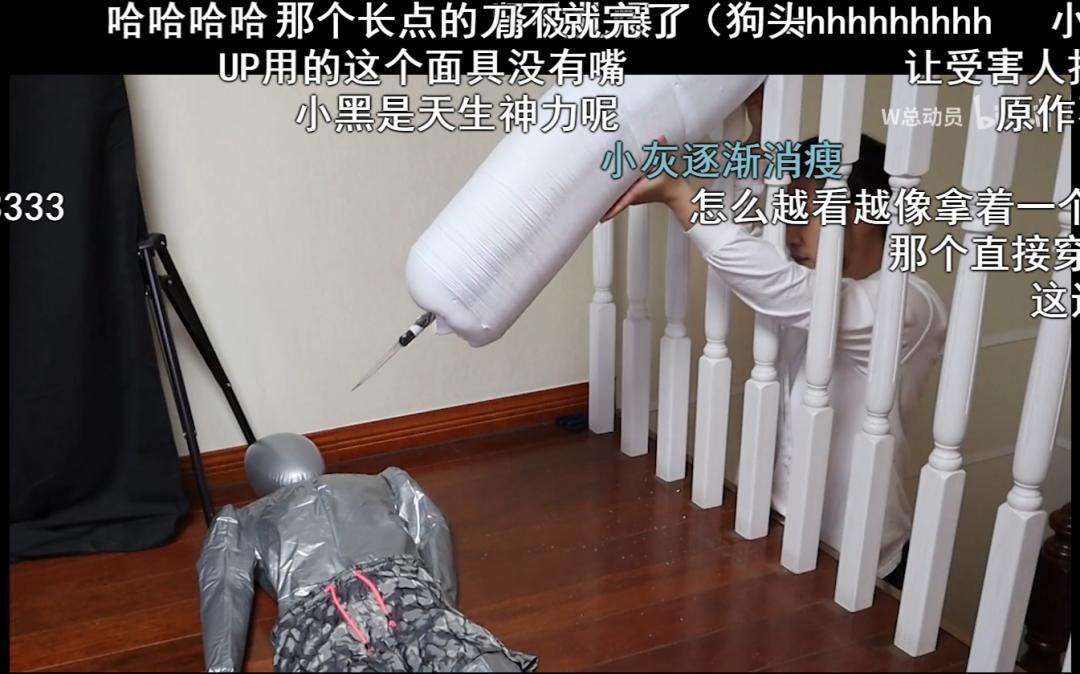 UP主W总动员还曾亲自演示过“面具大蛇”手法。结果发现,光是把200个面具穿进松紧带就用了好几个小时,而且很难把它们拉动,更别说用末端的尖刀准确地刺到人了。