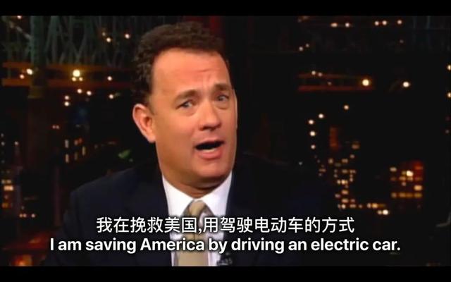 汤姆汉克斯在脱口秀节目的时候为EV1大唱赞歌:我在驾驶电动车,拯救美国(空气、气候变化)。