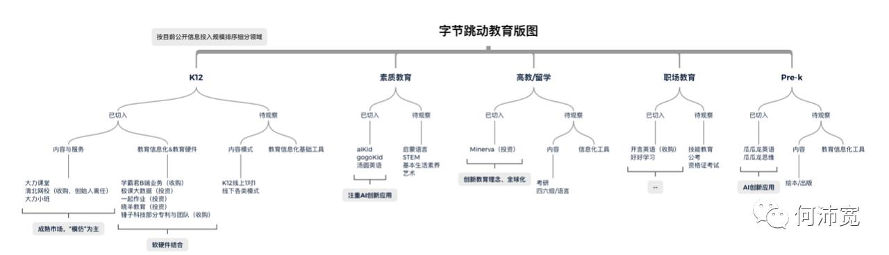 但再次强调,如果主要通过简单收购公司(如上文K12提及)并入教育业务版图,创始团队没有后续参与(且若字节跳动原本没有自营基础)的模式,并不会帮助字节跳动深耕某项教育事业(不能做成赛道头部的角色)、也不能助推教育业务出奇迹。
