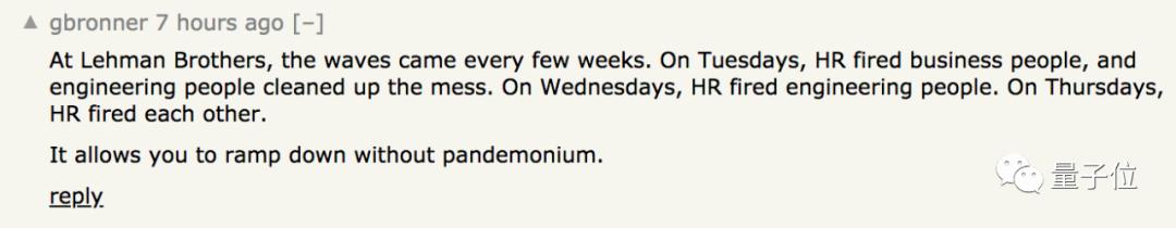 雷曼兄弟当年的裁员潮每隔几周就有一次:周二,HR开掉商务,让工程师来擦屁股;周三,HR开掉工程师;周四,HR们互相开掉了。