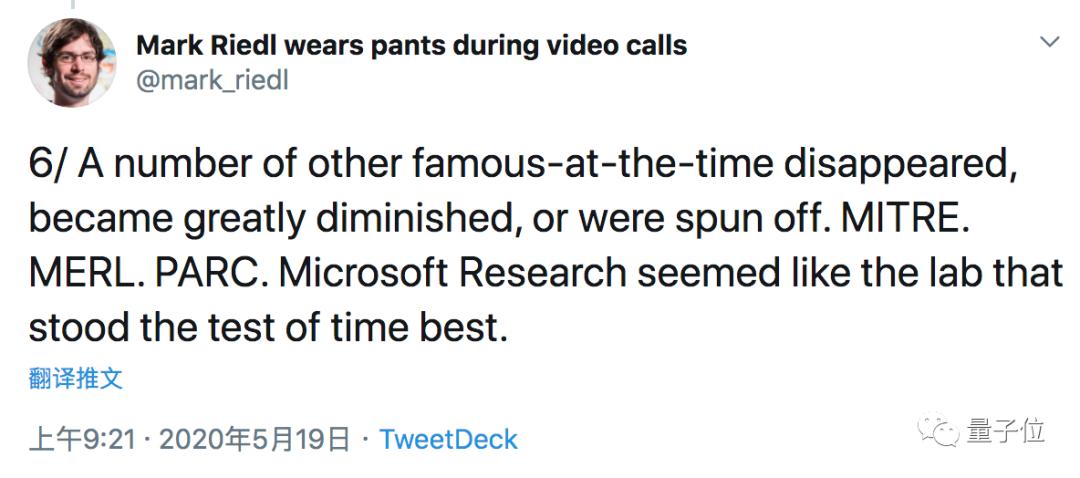 研究AI的佐治亚理工学院副教授Mark Riedl听到这条消息后说,出现财务问题的时候,实验室往往是第一个被关掉的,令人想起互联网泡沫破裂的时候,各种企业实验室里,也就微软研究院最长寿。