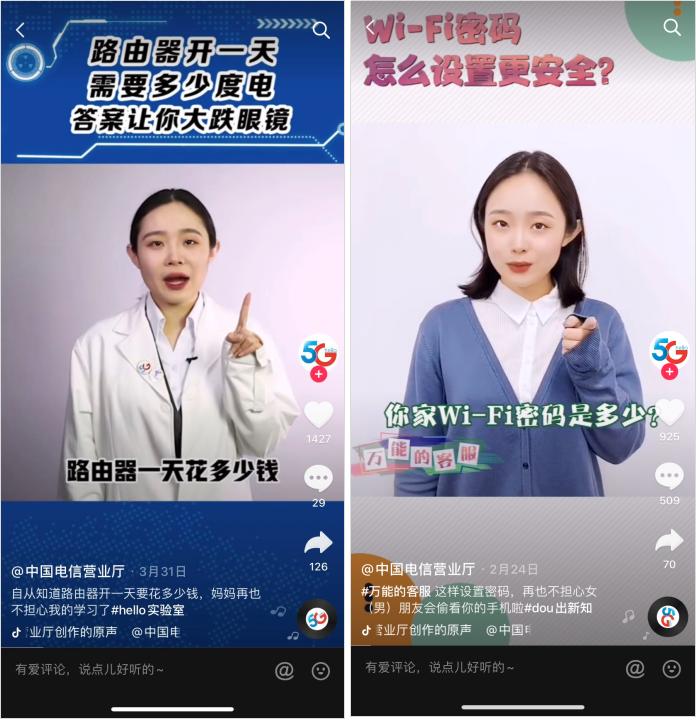 这里我以联通、移动、电信的 PK 为例。其实,移动和电信发的内容都比较杂,电信的标签相对明显,他们会让客服以专业形象出镜做知识科普,移动前期并没有标签。