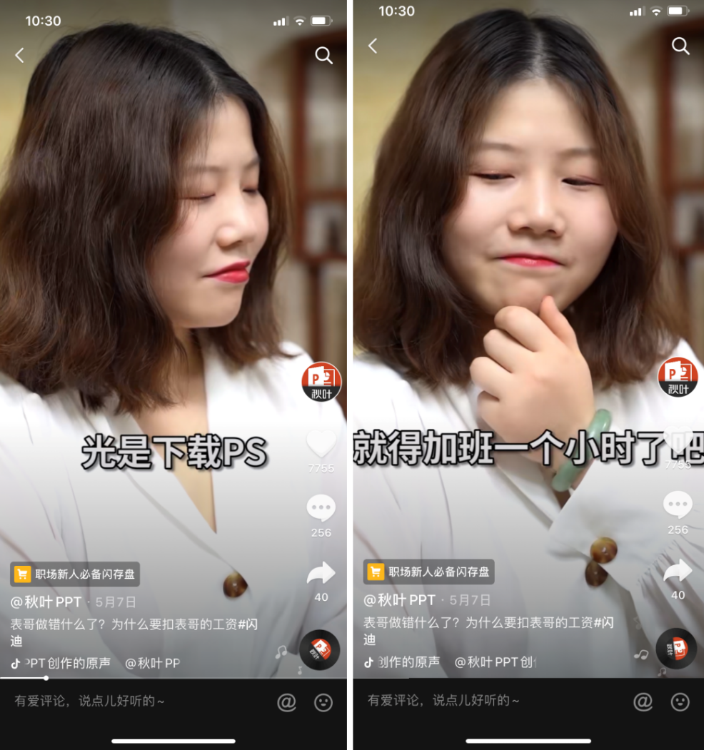 例如,@秋叶PPT 的用户主要是职场人士,他们的视频抓住了职场中员工与老板、客户的关系,经常设计一些“老板要我加班”、“客户有麻烦的需求”等情节带来共鸣。
