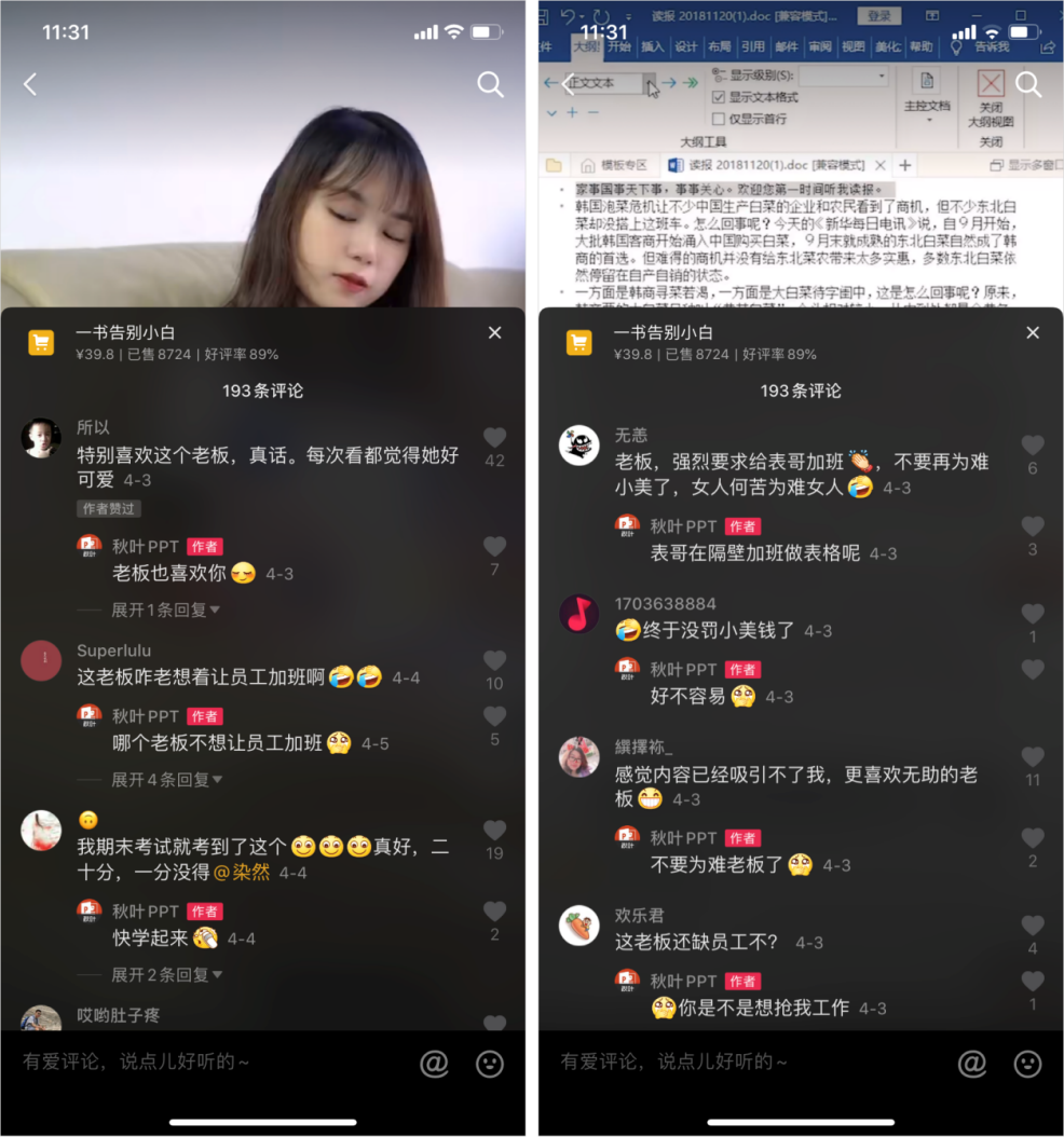如何让用户愿意评论呢?除了内容本身的质量外,还有一个小技巧,可以在视频中增加槽点。例如,我们前面提到的 @秋叶PPT,“老板经常刁难员工”这个点,就经常被大家拿出来讨论。