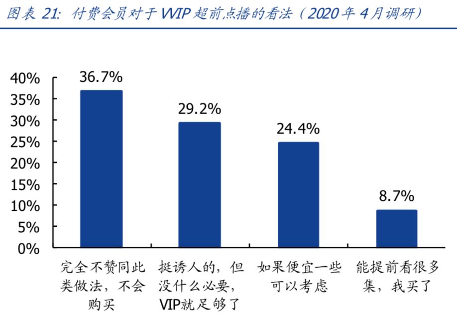 近日,国盛证券基于1078名长视频用户进行调研发现,视频VIP用户中仅有8.7%的受访者表示购买过超前点播付费业务,但表示完全不赞同此类做法和觉得没有必要的用户占比65.9%。