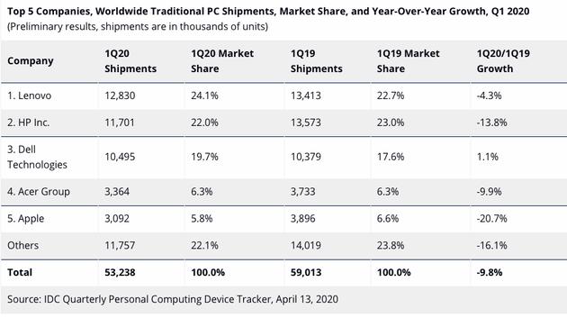 这样的收入结构意味着,实际上,个人电脑及智能设备业务才是联想最大的营收支柱。IDC数据显示,2020年Q1,全球PC出货总量为5323.8万台,同比下滑9.8%;联想集团2020年Q1的PC出货总量为1283.0万台,同比下滑4.3%,但市场份额同比上升1.4%至24.1%,仍位列全球第一。