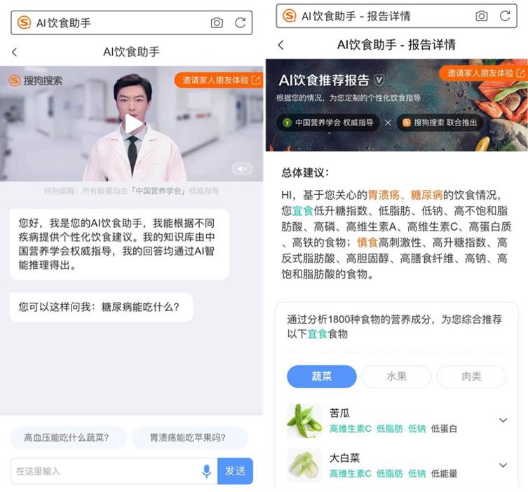 近日,搜狗搜索联合中国营养学会推出“AI饮食助手”工具,这款基于知识计算与自然交互技术的AI饮食助手将为公众打造7×24小时在线的“AI营养师”服务,且可根据不同疾病为用户提供个性化饮食指导。