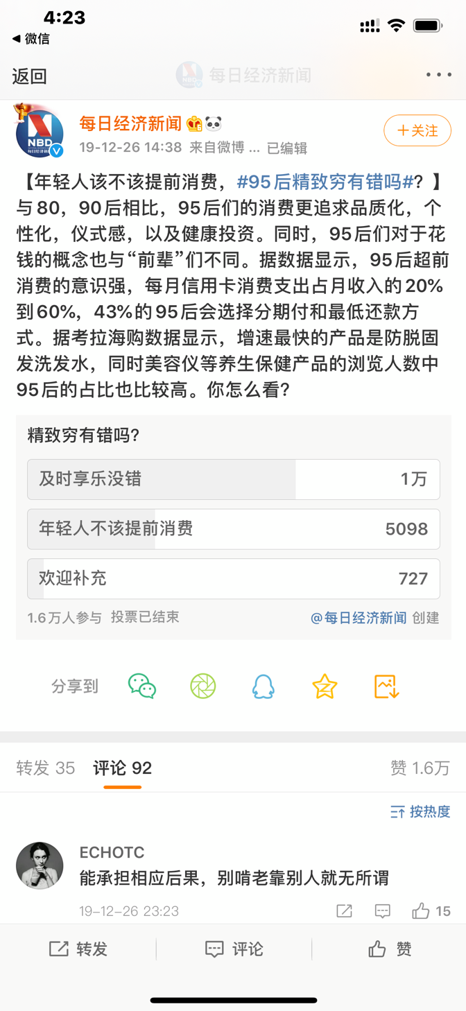 所以比起80后、90后,更追求品质化消费的95后选择“及时享乐”,甚至每月信用卡的日常消费支出能占到月收入的60%。对于“精致穷”的话题,在每日经济新闻的一份投票调查结果显示,1.6万参与人中,认为“及时享乐没错”的占到62.5%;但认为“年轻人不该提前消费”的占到31%。