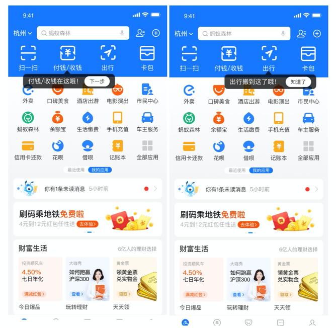 在下一个版本的支付宝中,将首页的收钱码和付钱码合并,空出的位置留给“出行”。以后不管是坐公交地铁、骑共享单车、出门打车,都可以在这个固定入口,一键直达。这也是“出行”首次出现在顶栏位置,仅次于“扫一扫”、“收付款”,用户使用更方便,也意味着支付宝将出行放在更重要的位置了。