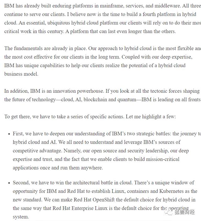 IBM和Red Hat拥有独特的竞争优势资源,我们可以利用这些资源赢得云架构之战。我们在开源和安全方面的领导地位,我们深厚的专业知识和信任,以及我们给予客户独特的能力,让他们能够一次性构建关键任务应用程序并在任何地方运行它们。与Red Hat公司一起,我们正在建立Linux、容器和Kubernetes作为新的标准。这赢得了混合云的架构之战。