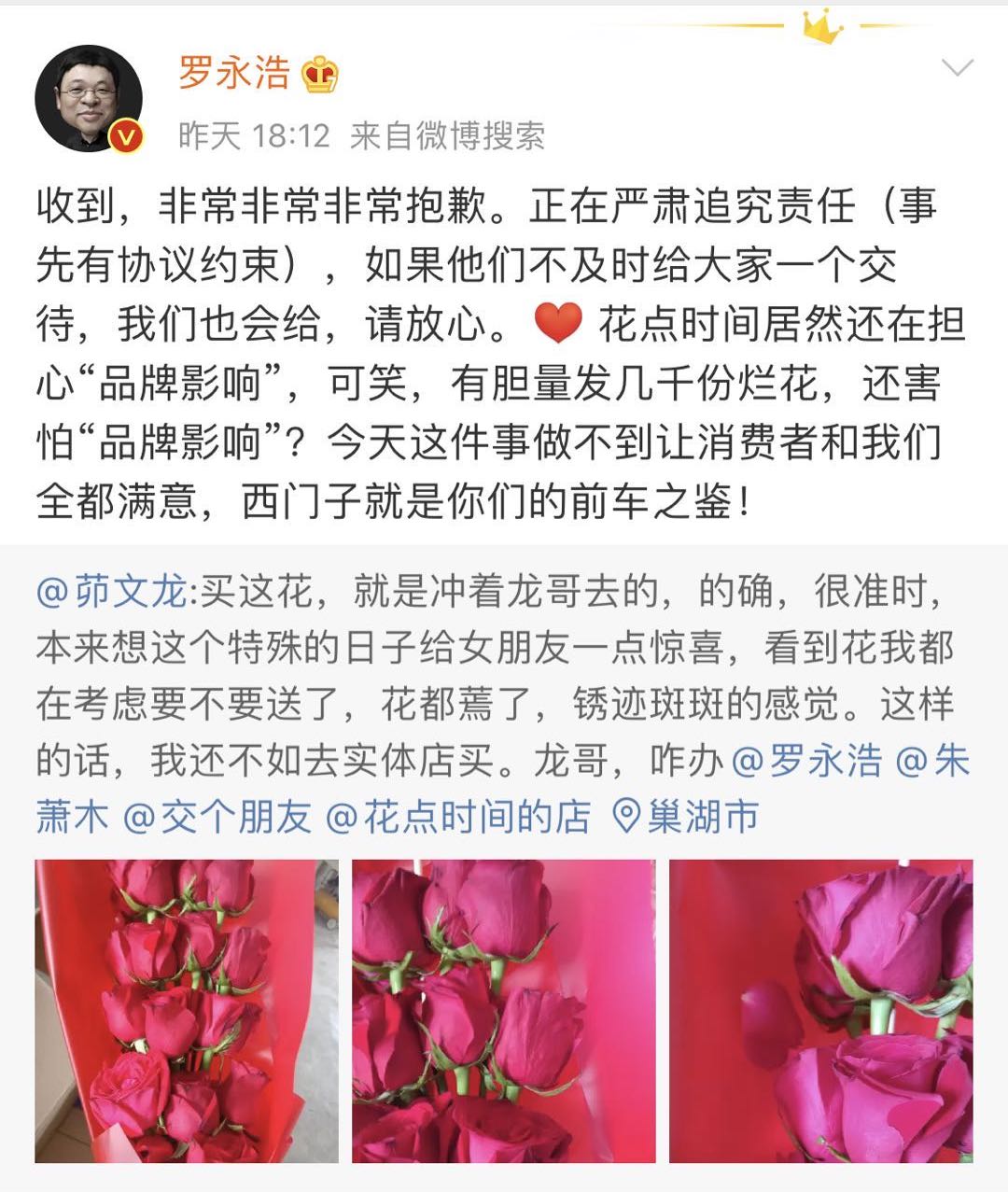 多位用户称花点时间的鲜花产品有打蔫等质量问题。图片来自罗永浩微博。