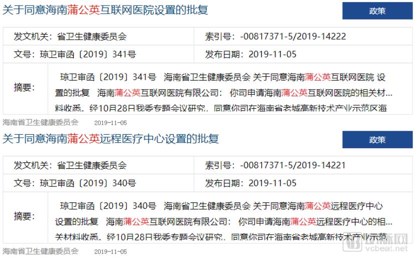 海南省卫健委官网上显示,2019年11月5日,海南省卫健委已经批准了百科名医网的子公司在海南省老城高新技术产业示范区海南生态软件B-13A楼2、4层设立蒲公英互联网医院和蒲公英远程医疗中心。按照批复中要求的6个月筹建期,该项工程目前应该已经进入验收阶段。