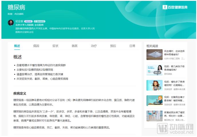 以百度搜索和百科健康医典为例,如今在百度上搜索医疗健康相关的词条内容,排在第一位的就会是百度健康医典中收录的相关内容。其所有内容都经过行业专家的编审,包括了概述、病因、诊疗流程一直到预后的全部信息。