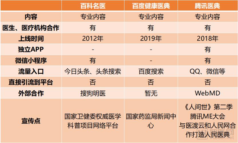 从流量入口就能看出,三款产品的功能都更像是搜索引擎的附带插件,为搜索引擎提供增量信息。百科名医网和百度健康医典都没有APP,百度健康医典甚至没有独立的微信小程序,这与他们搜索引擎插件的定位吻合。毕竟插件只是用来提供功能,独立APP反而会分流。腾讯医典在三款产品中是相对独立的一个。腾讯医典在2019年初就发布了APP。在宣传上,腾讯医典也更积极。
