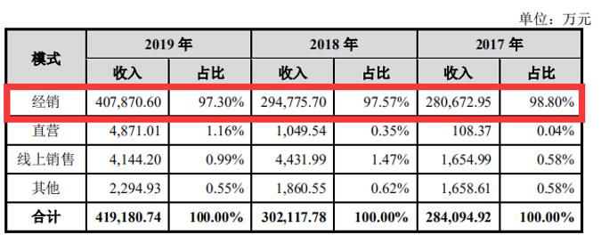 不仅如此,销售渠道上东鹏饮料还严重依赖经销商模式。截至2019年底,东鹏饮料共有1263家经销商,销售网络覆盖全国100万家销售门店。2017-2109年,东鹏饮料经销模式下的销售收入分别占当期总收入的98.8%、97.57%及97.3%。