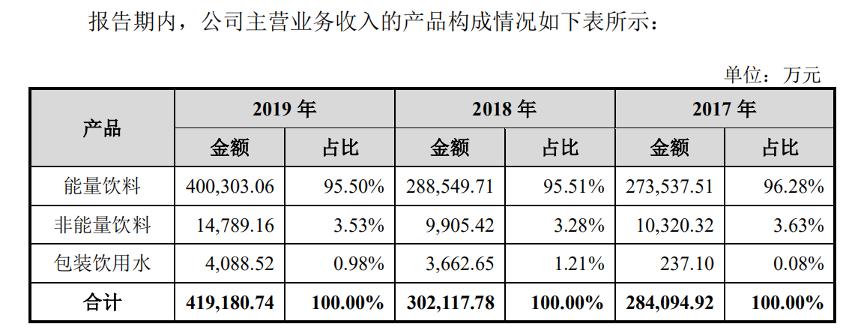 招股书显示,2017年至2019年,东鹏饮料实现营业收入28.44亿元、30.37亿元、42.09亿元,同期公司经营活动产生的现金流量金额分别是1.89亿元、1.95亿元、12.11亿元。从营收构成来看,能量饮料市公司的绝对主导产品,2017-2019年度分别贡献收入27.35亿元、28.85亿元和40.03亿元,分别占公司总收入的96.19%、94.99%和95.11%,产品结构较单一,呈现出“瘸腿”的局面。