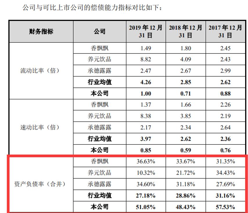 “豪横”的分红背后,其实东鹏饮料的资产负债率明显高于同行。2017-2019年,行业内香飘飘、养元饮品、承德露露三家可比公司的资产负债率均值分别是31.16%、28.86%和27.18%,东鹏饮料的资产负债率分别为57.53%、48.43%和51.05%,比行业均值高出20个百分点。