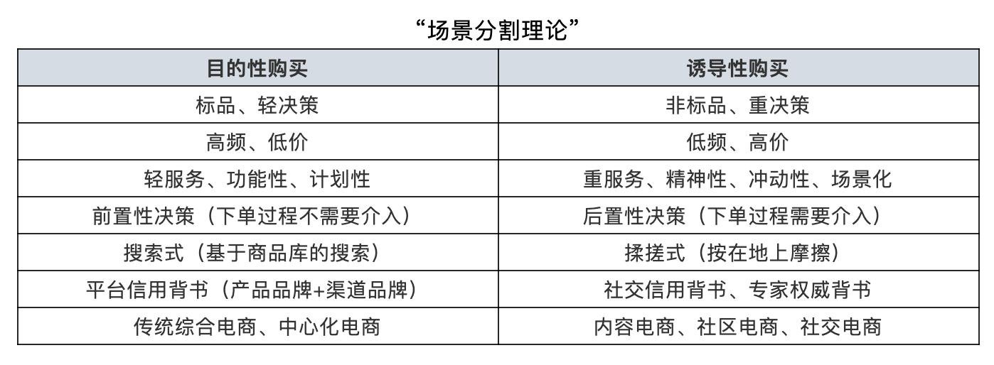 对于前者,取决于所售商品的专业属性、消费者决策心智以及相应的转化机制。我曾提出过一个“场景分割理论”来区分“中心化电商”和“内容电商、社区电商、社交电商”等不同电商业态所针对的不同消费场景。