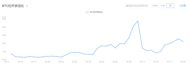 观察OKEx合约大数据发现,从5月19日到5月20日多空人数比有所上升,且融资融券业务的杠杆多空比也从本月15日的1.1上升至目前的2.1,基差结构仍然维持在升水0.5%以上,市场看多情绪持续加重,不少投资者都在高位加了高杠杆,只等比特币破万拉高。