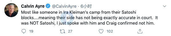 有意思的是,还有人认为这个比特币地址曾出现在 Craig Wright 所列的清单中,因此怀疑是 Craig Wright 移动了这些比特币。而对此 CoinGeek 创始人、BSV 支持者 Calvin Ayre 今日发推称:“确认不是Craig Wright,我刚和他谈过。”