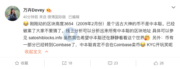 Primitive Ventures联合创始人Dovey Wan在微博表示,刚刚动的区块高度3654(2009年2月份)是个远古大神的币,而不是中本聪。可通过线上分析可以分析出所有中本聪的区块地址,具体可以参见satoshiblocks.info。另外,其中一部分币已经转到Coinbase了,因为KYC,中本聪也肯定不会在Coinbase卖币。