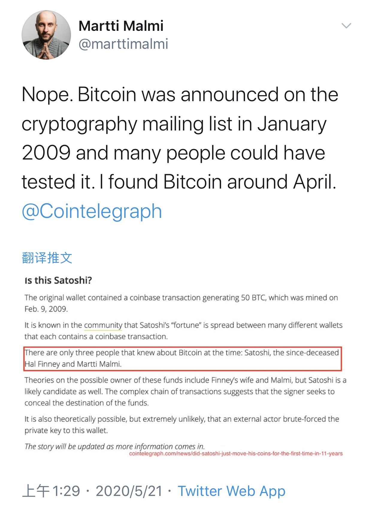 比特币早期开发者Martti Malmi也否认这个地址是他的:“我是在 2009 年 4 月左右发现比特币的,”Martti 在5月20日在推特上回应相关问询时候说到。而这个出现比特币转移的钱包比 Malmi 的接触比特币的时间还早了两个月。