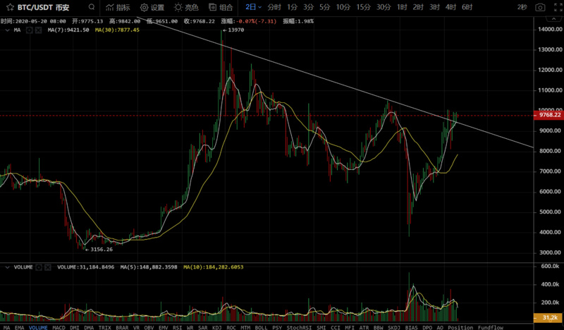 5月20日下午,比特币上冲9850美元未果,而后迅速向下,最低来到9650美元,然后在9760美元高位调整,多次试图破万。市场上不少投资者也从K线图分析得知,比特币目前接近趋势三角形的尽头,预计变盘在即。