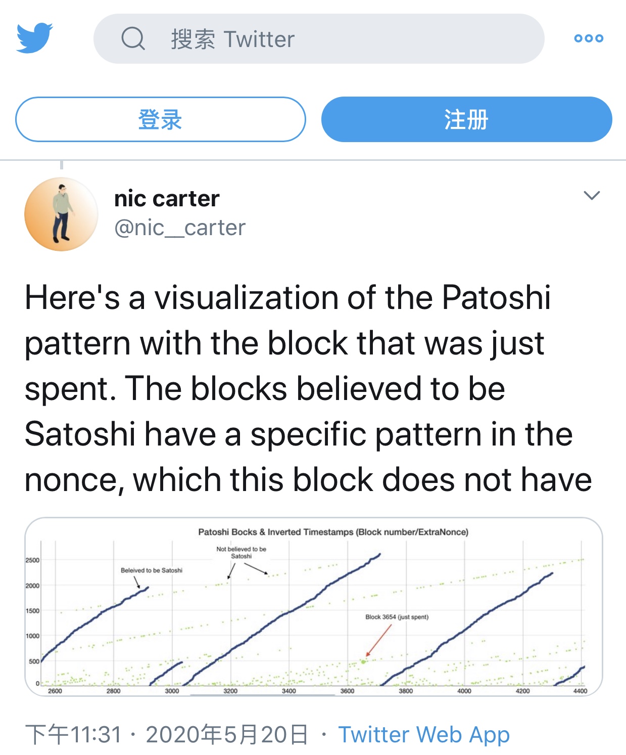 Coin Metrics联合创始人Nic Carter从比特币的nonce值分析了这50枚比特币不一定属于中本聪地址,Nic表示,“中本聪开采了一组特定的区块,中本聪在开采Satoshi区块时使用了特定模式,但区块3654不是Patoshi模式。关于中本聪的比特币的争论实际上比人们通常所知道的要多。按照媒体报道的方式,您可能会认为一个巨大的钱包归属于中本聪。实际上,这些地址的不确定性要大得多。”