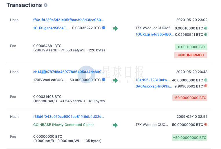 最早曝出这个消息的是链上数据监测平台Whale Alert:2009年2月10日区块高度3654挖出的50 BTC从地址17XiVVooLcdCUCMf9s4t4jTExacxwFS5uh转移至两个地址,之后另一个地址向该地址转账,目前该地址余额为0.0001 BTC。