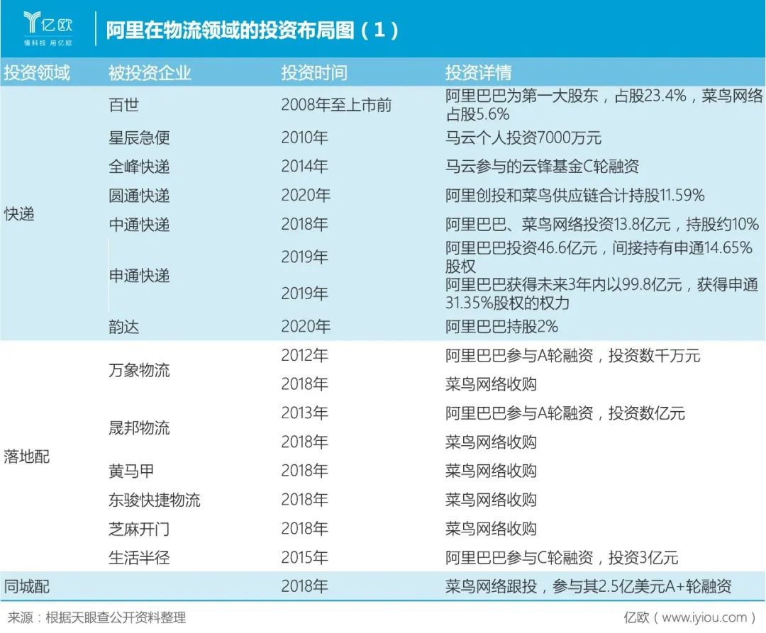 2019年3月,阿里斥资46.6亿元入股申通,获得14.65%的股权;7月与申通达成协议,允许其通过从申通创始人那里继续购买价值近百亿元的股票,并自2019年12月28日起的三年内,可成为申通的最大股东和实际控制人。