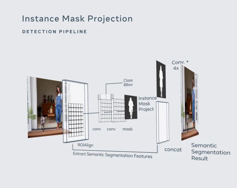 Instance Mask Projection可以检测整个服装产品并大致预测其形状。该预测用作改进每个像素的估计的指南,允许合并来自检测的全局信息。预测的实例图被投影到一个功能图中,用作语义分割的输入。
