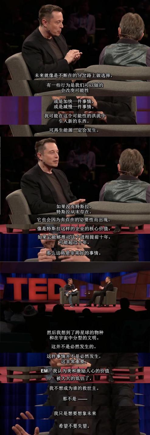 马斯克曾经说过,如果我不做特斯拉,人类做能源汽车这件事会晚十年;如果我不做SpaceX,不做星际移民,这件事就不会发生。