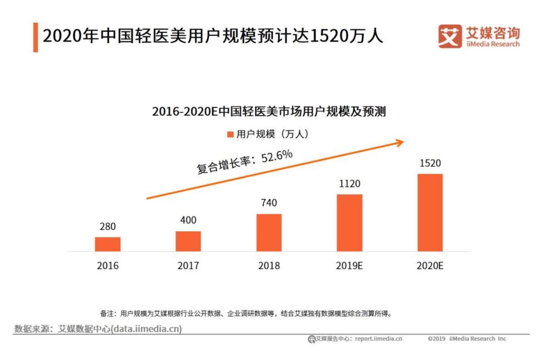 第三方咨询机构艾媒咨询发布的《2019年中国轻医美消费趋势研究报告》显示,2020年中国轻医美用户数预计将突破1500万人,复合增长率达52.6%。