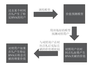 把根据这一组没有产生 HVA 的用户的数据预测出来的平均用户价值和他们实际的平均用户价值比较,就得到一个差值。这个差值就是这个时间段内用户产生HVA 带来的价值差异。整个模型的逻辑如下图所示。