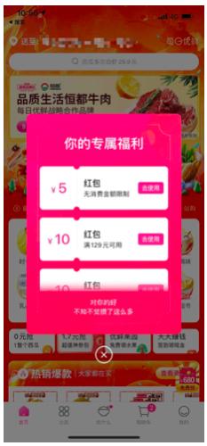 用户每天首次登陆每日优鲜APP即会弹出当日优惠券福利