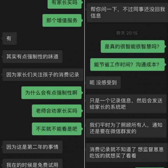由于没有在那个学校呆很久,陈女士加入那个“智慧校园”后,还没来得及办理增值服务便又转学了。于是笔者通过陈女士联系到当时就职于那个学校但目前已经离职的王老师,在咨询过程中对方坦言:“当时定的是第一年免费,第二年开始收钱,其实有强制性的味道,因为家长们关注孩子的消费记录。”至于是否真的“智慧”,该老师只称“没有感受到”“只是一个记录、发送的系统”,其他内容则表示不愿多谈。