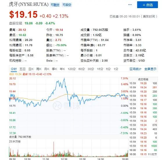 财报公布后,据美股研究社调查显示,虎牙盘后股价一度涨2%,但随后下跌近5%。截至发稿时,跌幅收窄至0.47%,报19.06美元。