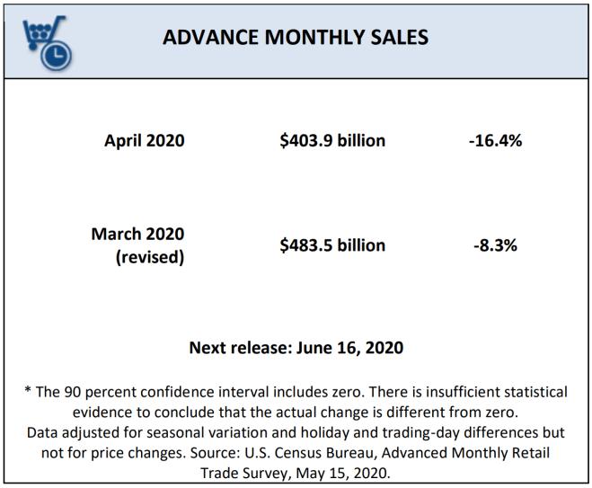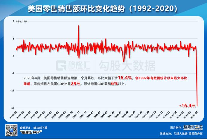 根据美国商务部发布的数据,今年4月零售数据初值跌至4039亿美元,环比下跌16.4%,连续第二个月刷新该数据自记录(1992年)以来的单月最大跌幅;同时,根据 美国全国独立企业联合会的数据显示,4月美国小企业主的乐观情绪降至7年来的最低点。