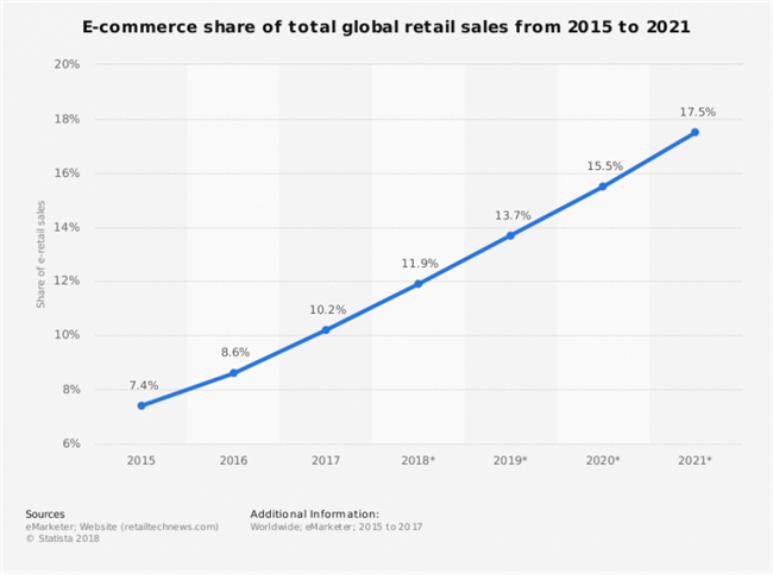 根据Adobe数字经济指数显示,与3月初“就地避难”禁令生效前相比,美国电商销售额4月份提升了49%;且今年1-2月美国B2C零售电商平台共获得了55亿次的访问量,销量较去年同期增长52%,消费者数量增长8.8%;预计到2021年,全球电商销售额或将占全球零售总额的17.5%。
