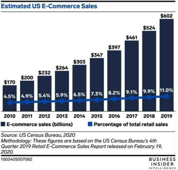 而在零售行业普遍呈现低迷之时,苏子和人们保持社交距离而闭门不出,线上购物开始走上主演舞台,电商的异军突起不容忽视,或开始成为今后美国零售商的主要增长动力(2019年美国电商销售额增长了14.9%,高于上年同期增长(13.6%))。