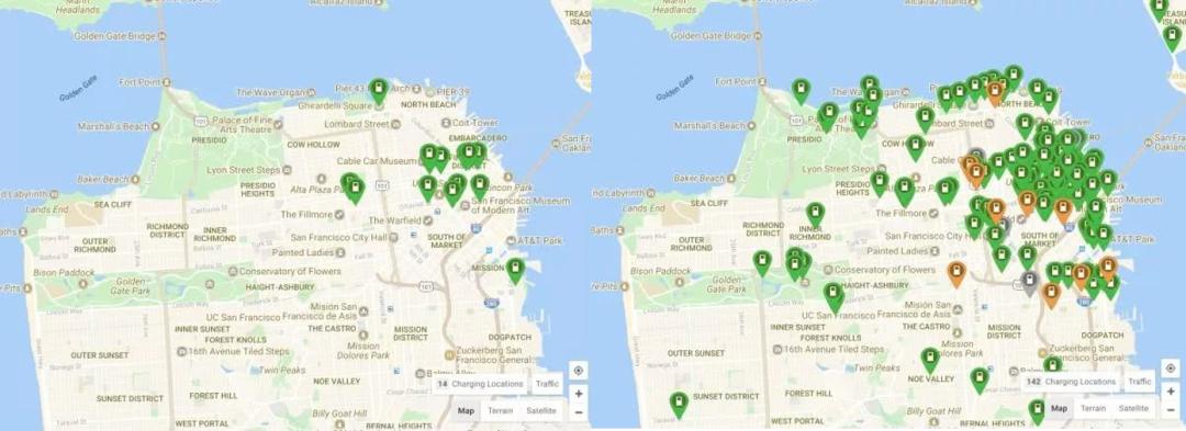 从小范围上来看,特斯拉与其他种类充电桩相比数量更少。比如在下面的旧金山地图中,左边的特斯拉充电桩仅有寥寥几个,而且一座超充站也没有;而右边的其他品种充电桩共有142处,总数量是特斯拉的10倍。