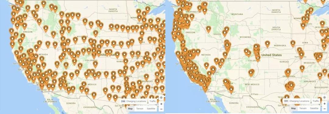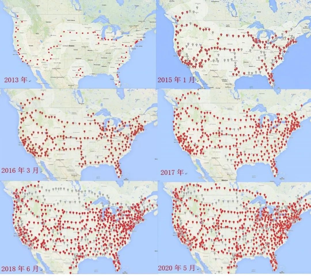 没有什么比对比图更清晰,近年来代表特斯拉超充站的红色标志越发密集。16年3月有些州还根本没有覆盖到超充,而到了2019年年底,特斯拉在美国已经建成了八百多个超充站,充电网络覆盖全美超过99%的人口区域。