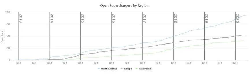 从数量上来说,特斯拉北美超充站的总数攀升的相当快。以北美为例,从2016年的260座,到如今的930座,特斯拉在北美“铺桩”4年实现2.6倍增长。